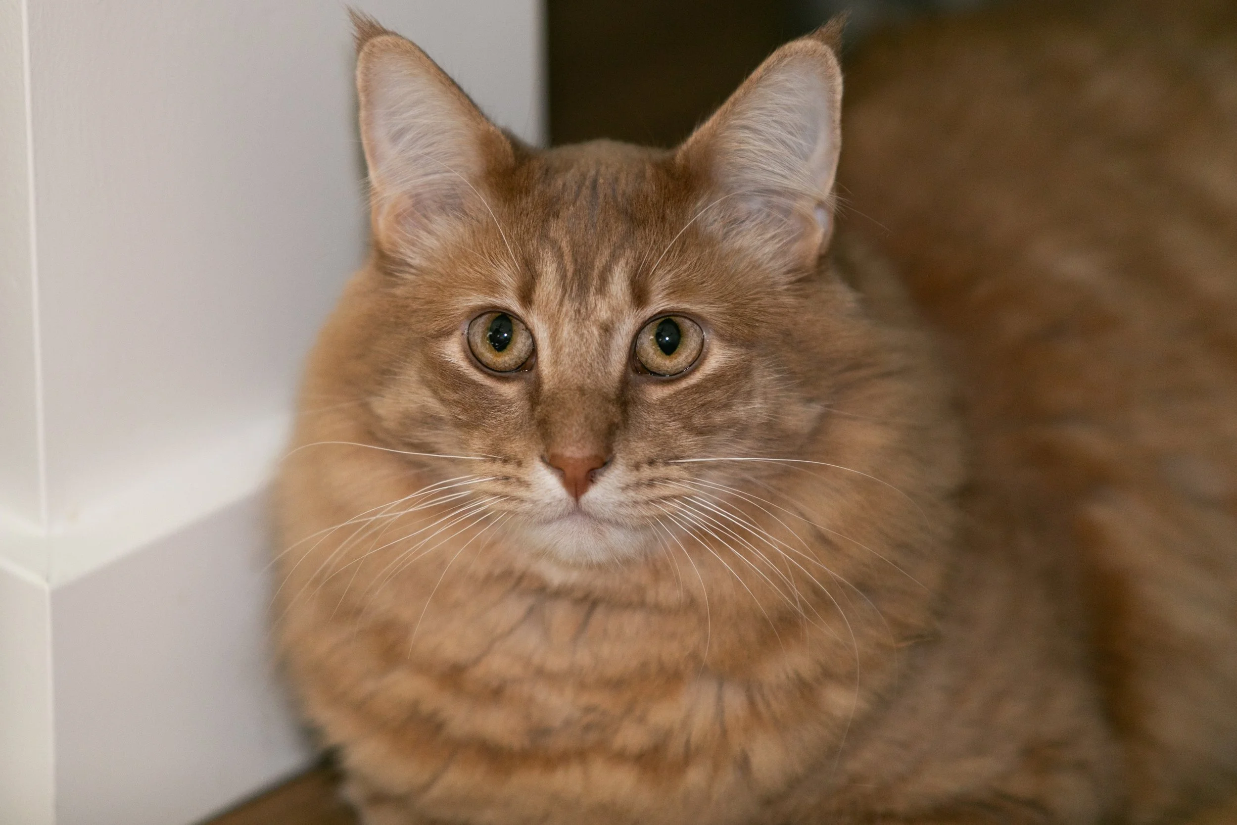 A close-up of a fluffy, orange tabby cat with green eyes, sitting on the floor near a white wall and light-colored furniture.