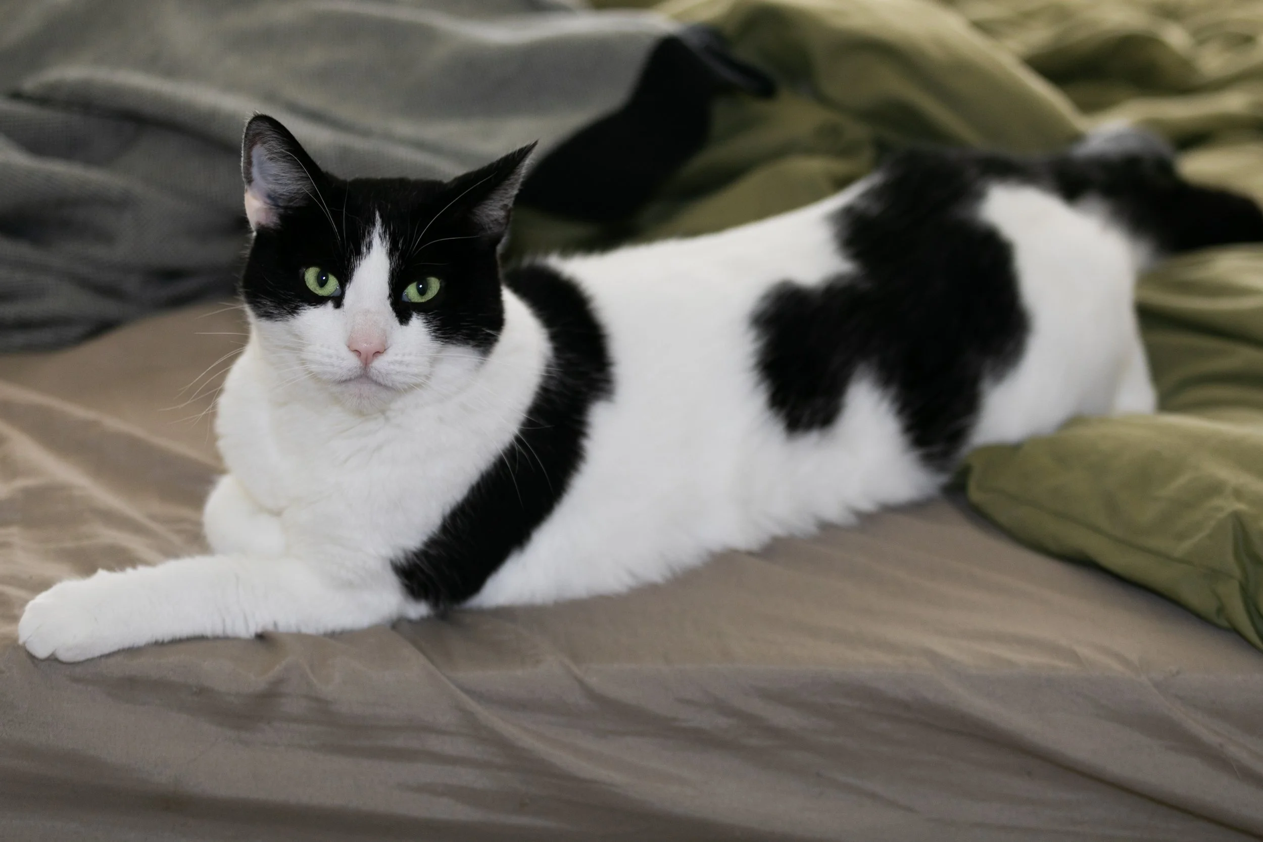 A black and white cat lying on a bed, looking at the camera, with green eyes and a pink nose.