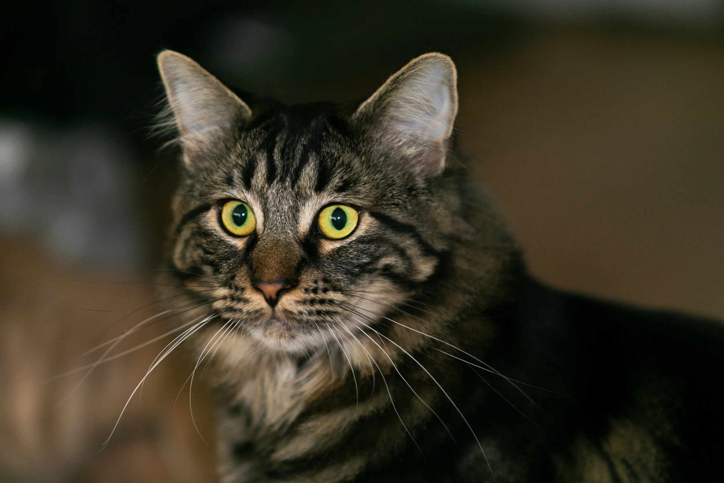 Close-up of a tabby cat with green eyes, looking to the side in a dimly lit room.
