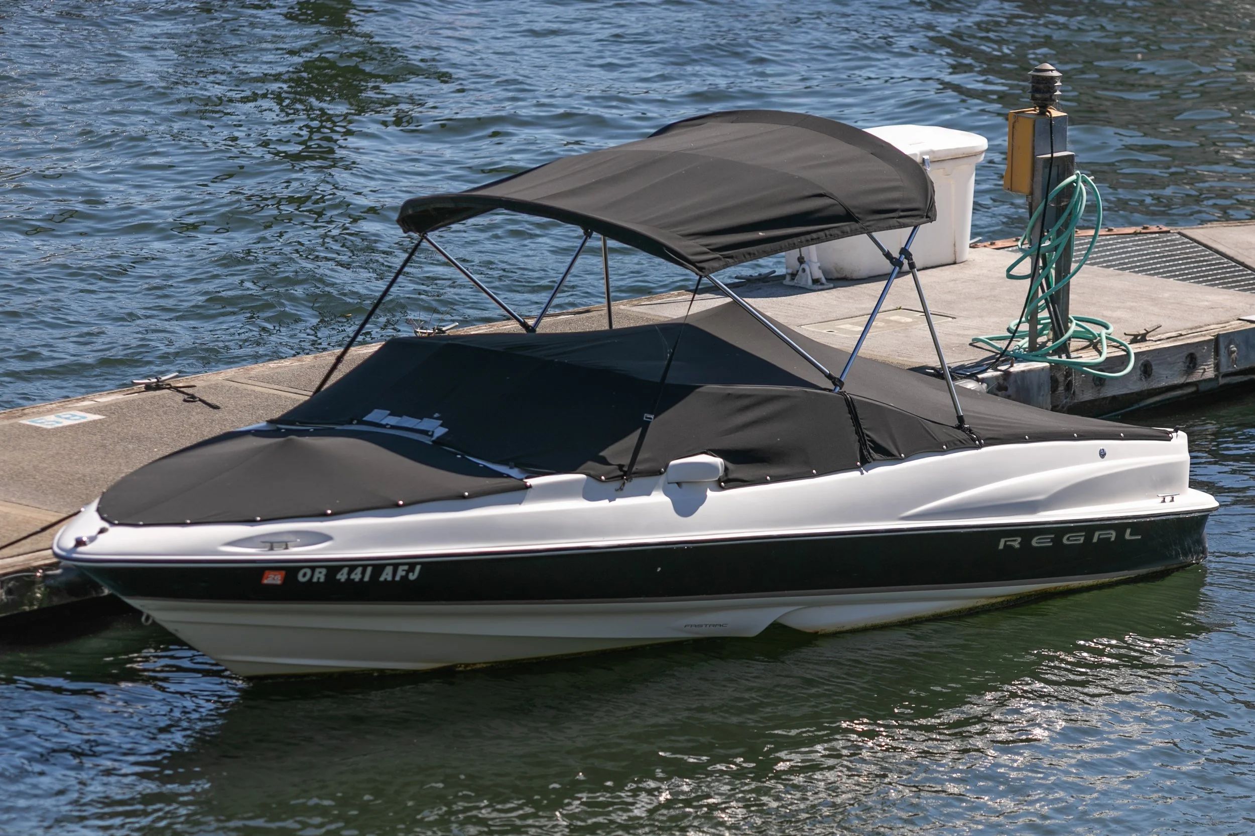 A white and black recreational speedboat docked at a marina, with a black canopy cover and a small black sunshade. The boat is secured to a wooden dock with a green hose and a white storage box nearby. Water is visible around the boat.