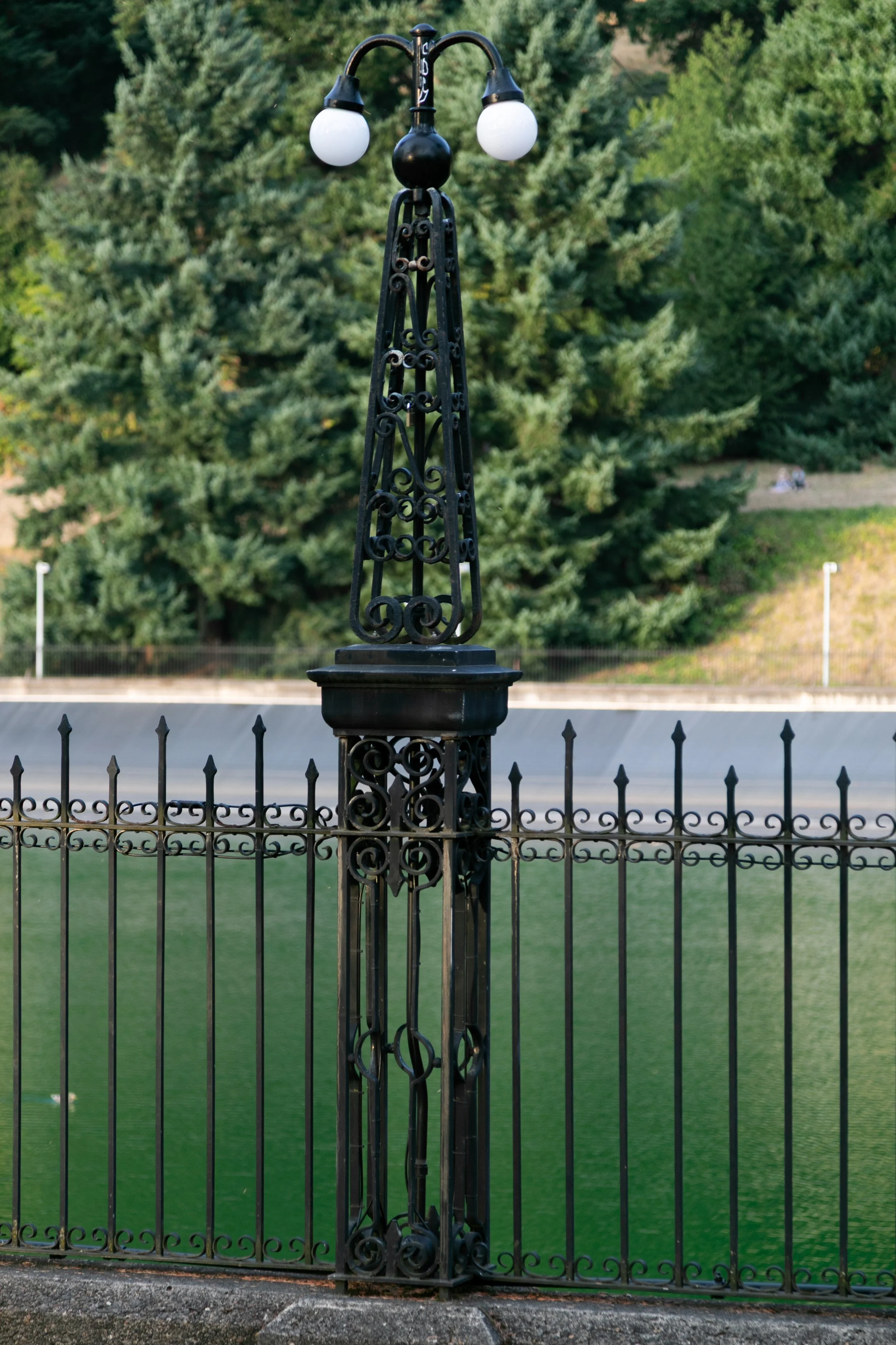 Black decorative street lamp post near a green water body, with a metal fence in the foreground and trees in the background.