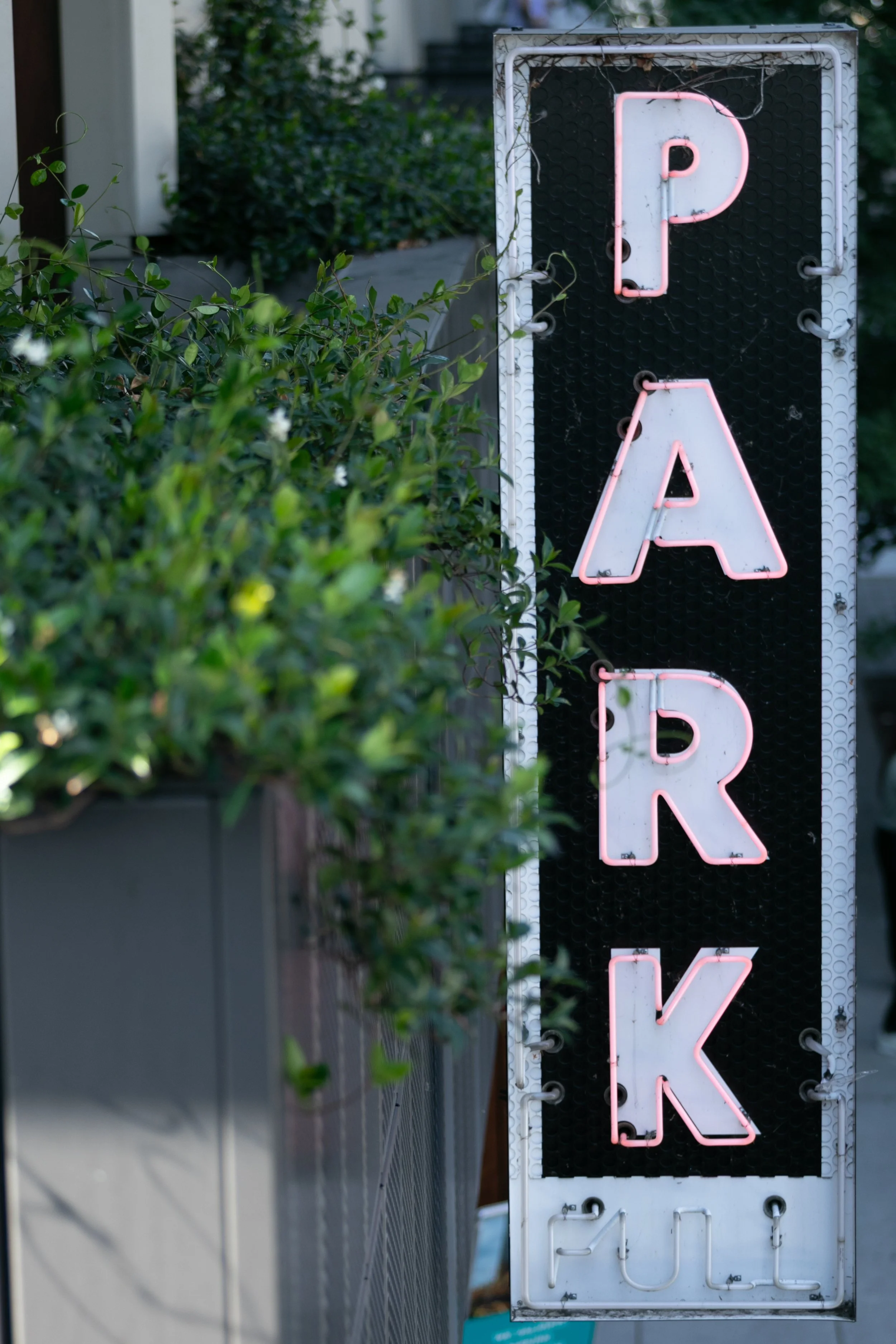 A vertical neon sign on the sidewalk that reads 'PARK' in pink capital letters, with the word 'PULL' in smaller white letters at the bottom.
