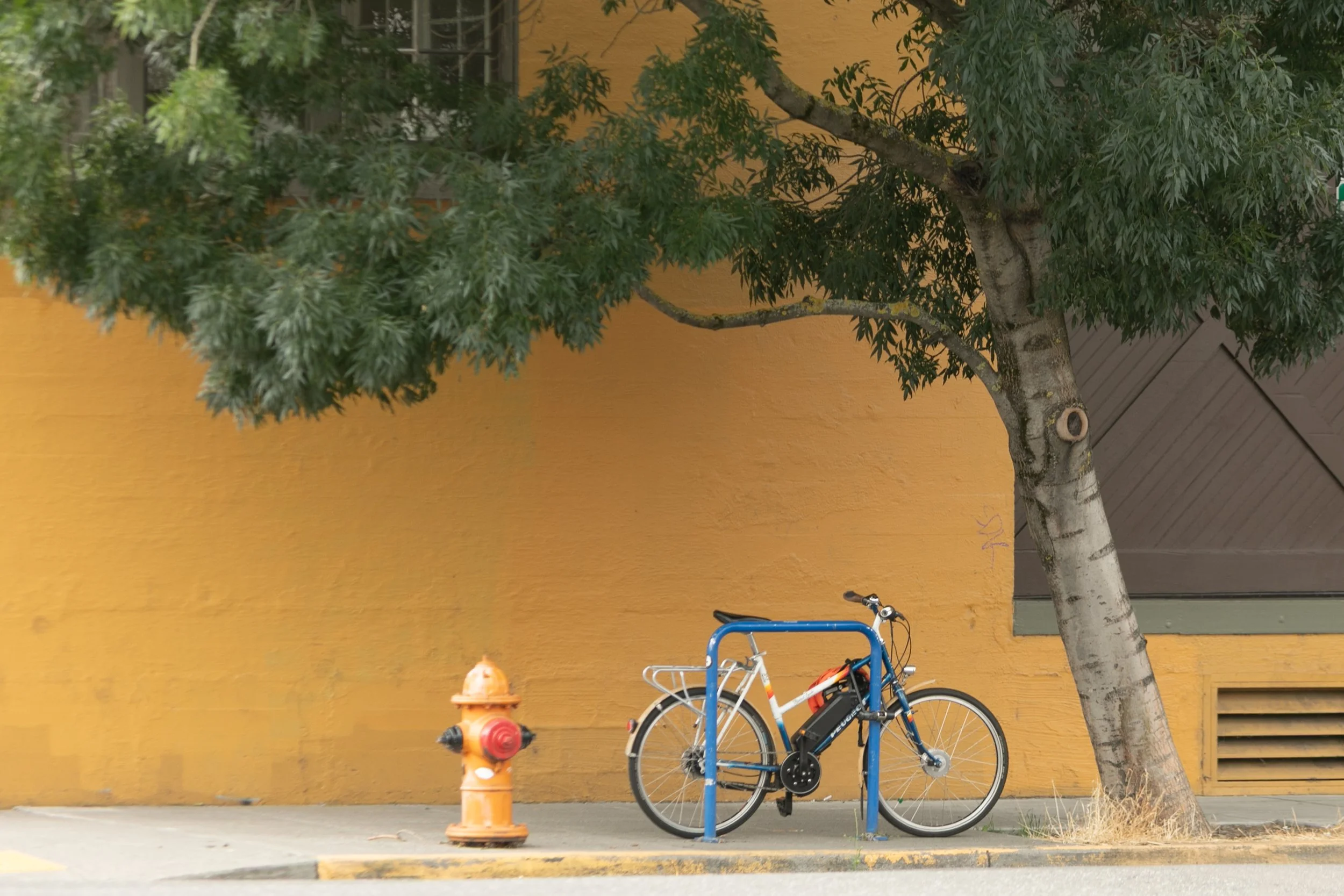 A stationary blue bicycle locked to a bike rack on a sidewalk next to an orange fire hydrant and a yellow wall with a large tree providing shade.