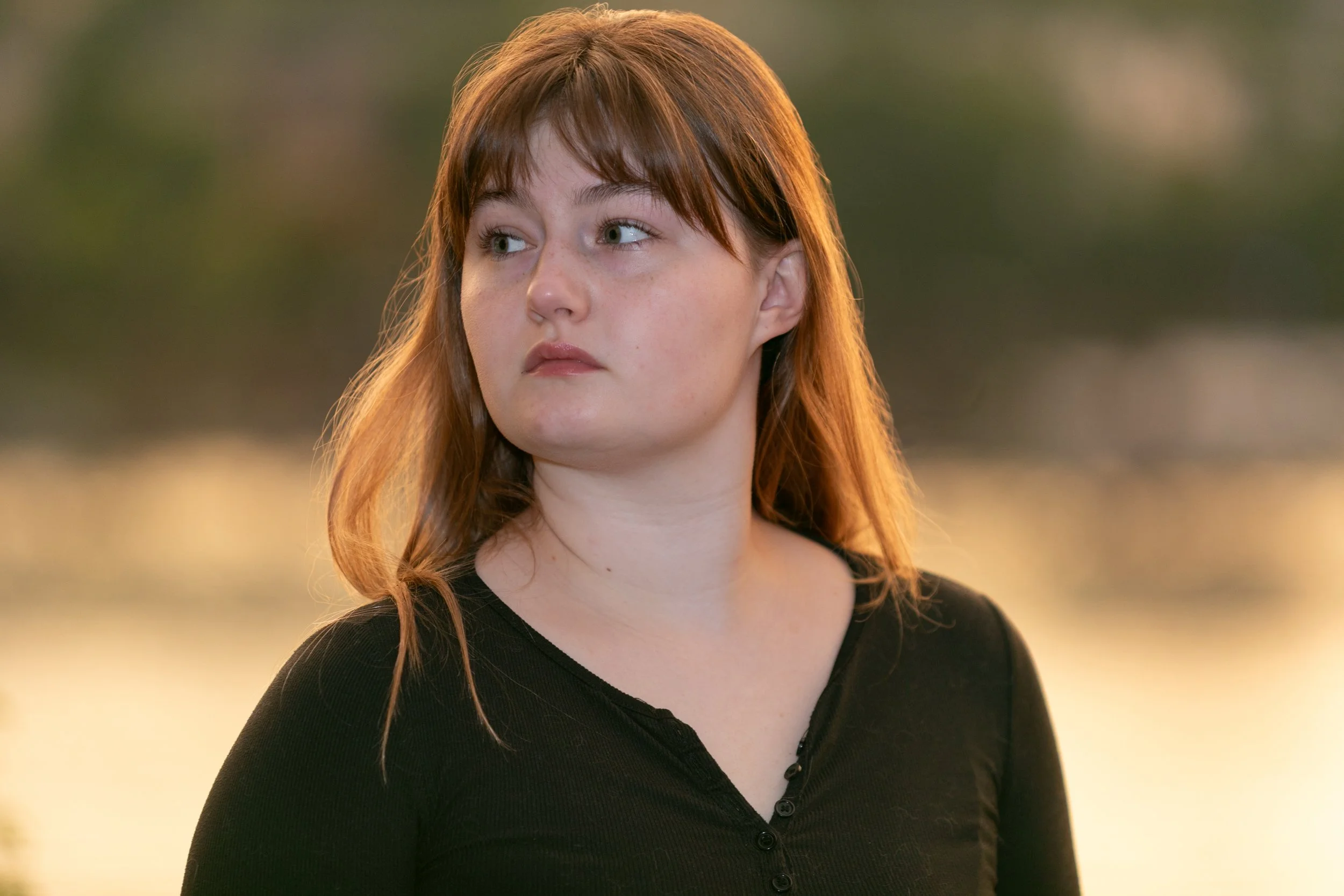 A young woman with red hair and fair skin standing outdoors at sunset, wearing a black top.