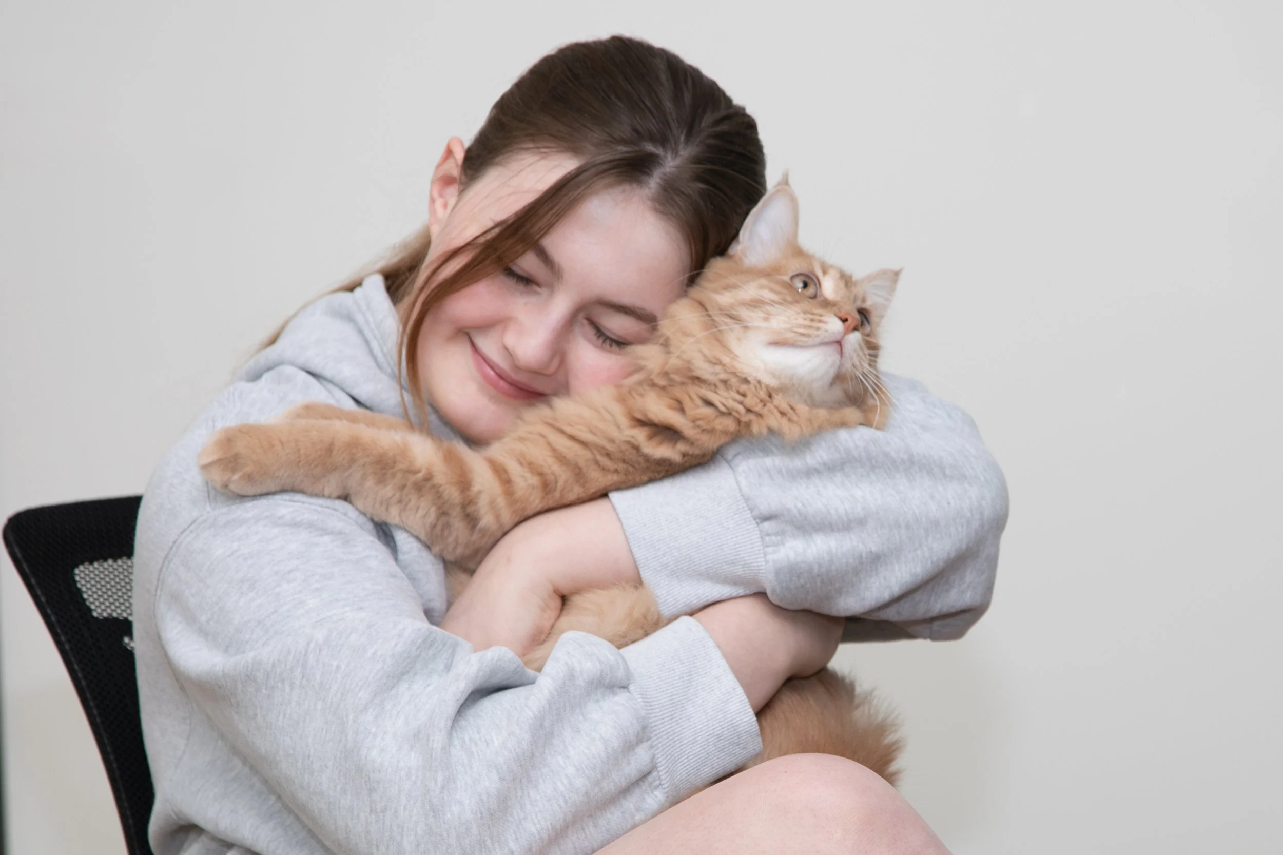 A young woman in a gray hoodie is hugging an orange tabby cat with closed eyes, showing affection and contentment.